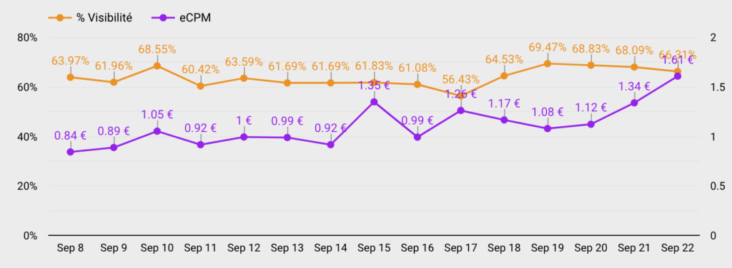 En este ejemplo, el 17 de septiembre de 2021 el publisher movió de posición un espacio publicitario para mejorar su viewability. Se puede observar que el eCPM aumentó con un decalaje de cinco días, el 22 de septiembre de 2021. Esto se debe al hecho que los datos de viewability a los que pueden acceder los compradores son normalmente una media de los resultados obtenidos en los siete días anteriores por el publisher. A partir del 22 de septiembre, el inventario de este editor fue apto para todas aquellas campañas publicitarias que requerían una tasa mínima de viewability, lo que permite aumentar la demanda y los eCPM.