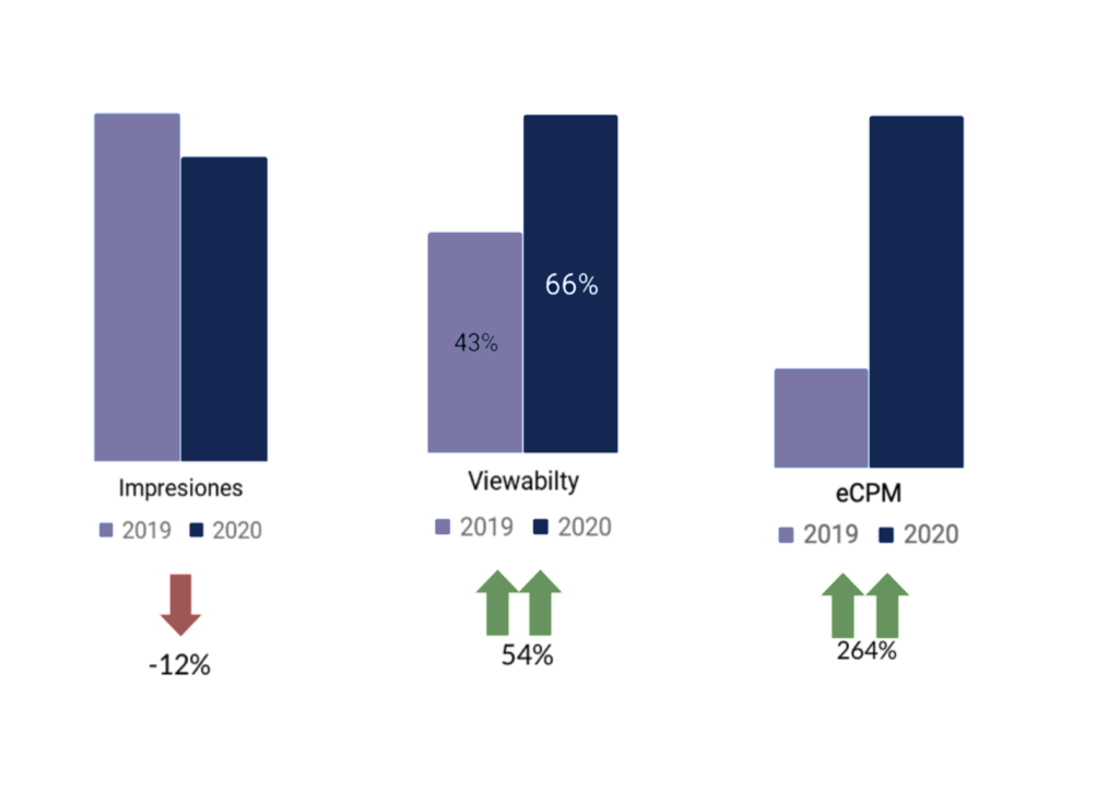 El control de refresh y el lazy loading hacen bajar el volumen de impresiones. Pero la mejor visibilidad, las optimizaciones de adserving y el incremento de competición compensan la baja de impresiones incrementando el eCPM en un 264%.