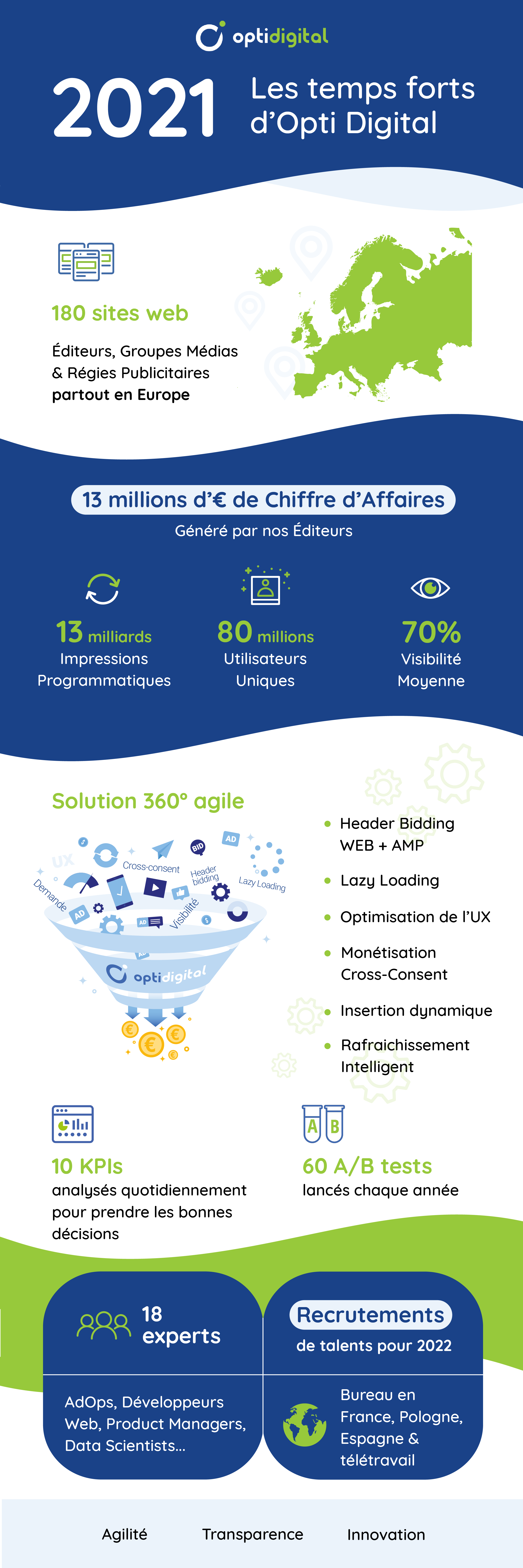 En l’espace d’un an, notre équipe a doublé. De Céret, à Lyon, en passant par Barcelone, Madrid et Wroclaw, l’équipe Opti Digital est constituée désormais de 18 experts et, plus que jamais, prête à affronter 2022 aux côtés des éditeurs, pour optimiser leur monétisation.